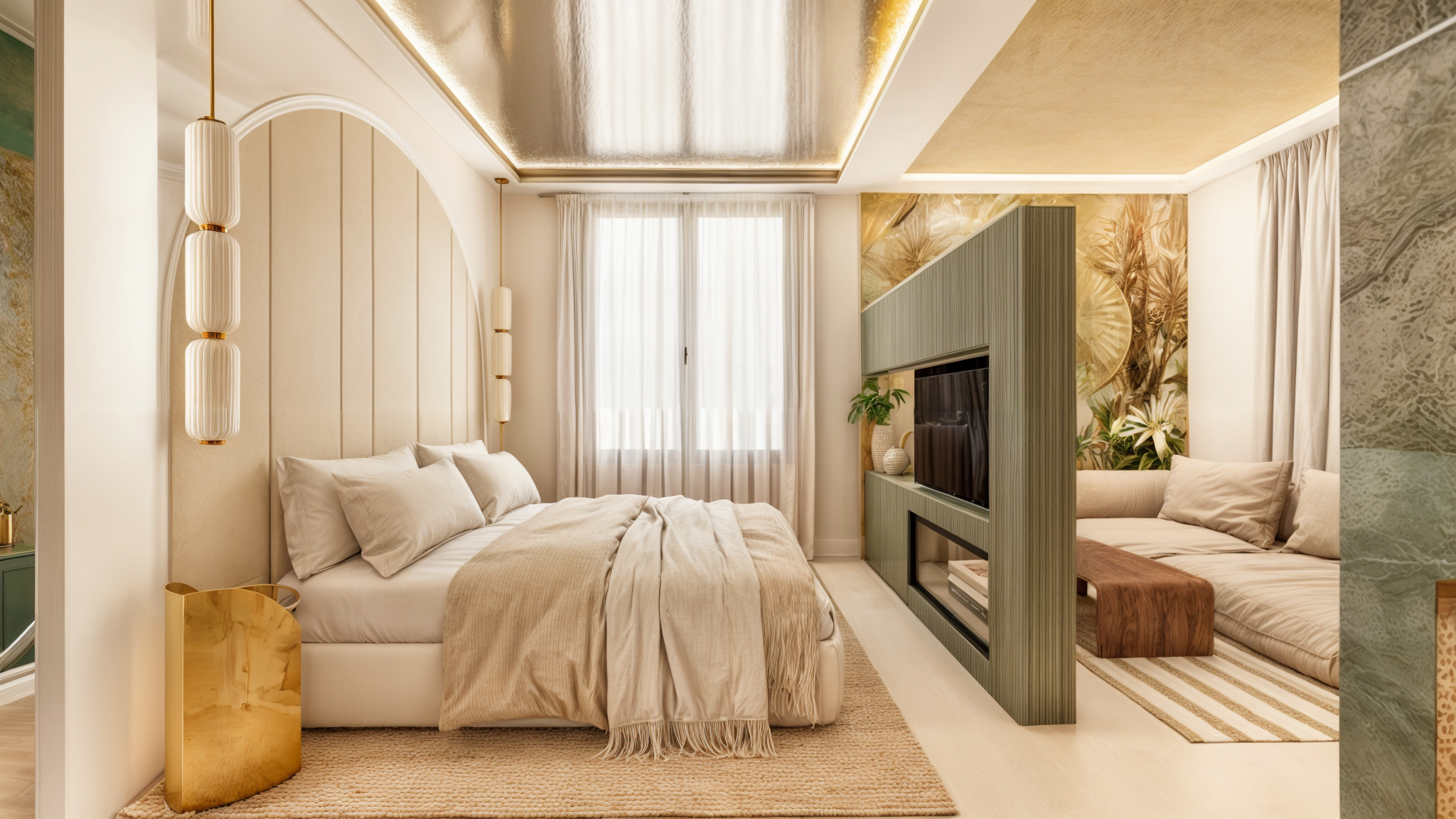 Los tonos verdes intensos, las texturas y la presencia de materiales como la madera, el ratán y el lino evocan un entorno natural, mientras que los toques dorados y las piezas decorativas seleccionadas aportan un aire de lujo discreto. Cada rincón ha sido pensado para estimular los sentidos: desde la iluminación cálida hasta los estampados botánicos que visten las paredes y textiles.