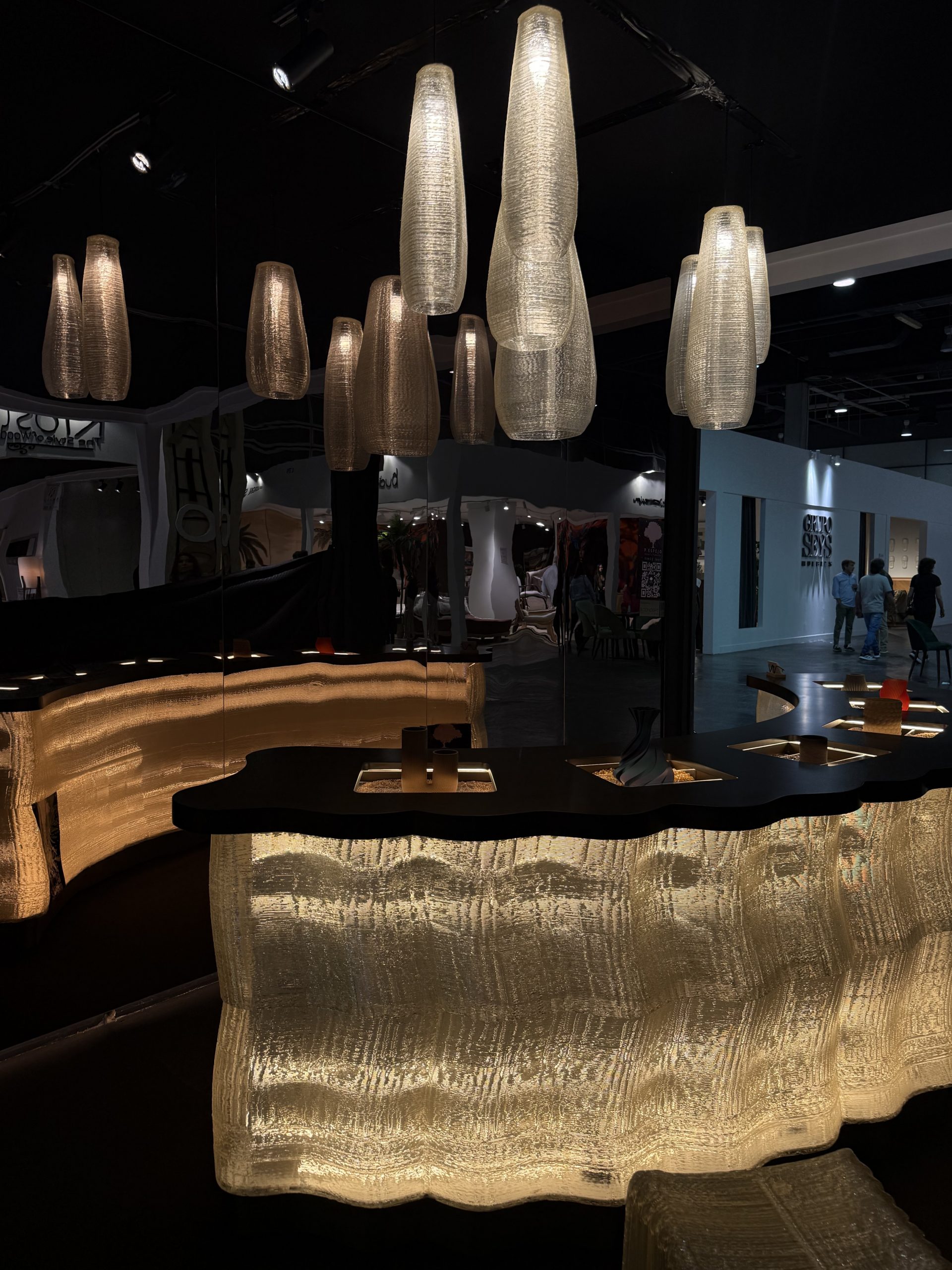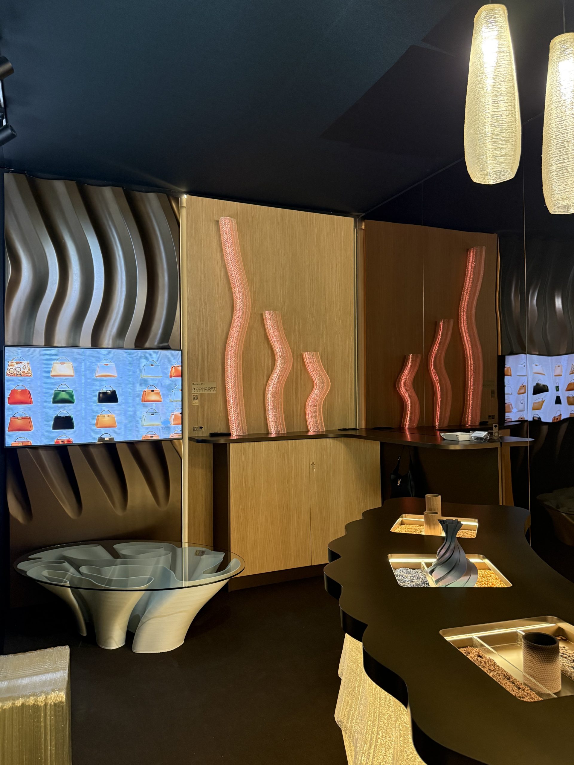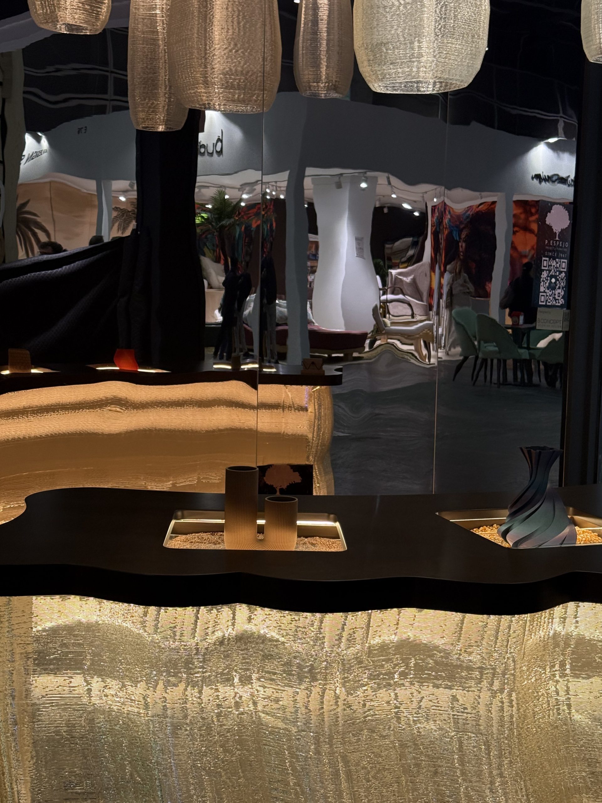 La inspiración marina también se refleja en una mesa auxiliar con formas que evocan un coral, acompañada de lamparas de pie retroiluminadas RGB que recuerdan a anémonas, reforzando la experiencia sensorial y creativa del stand.