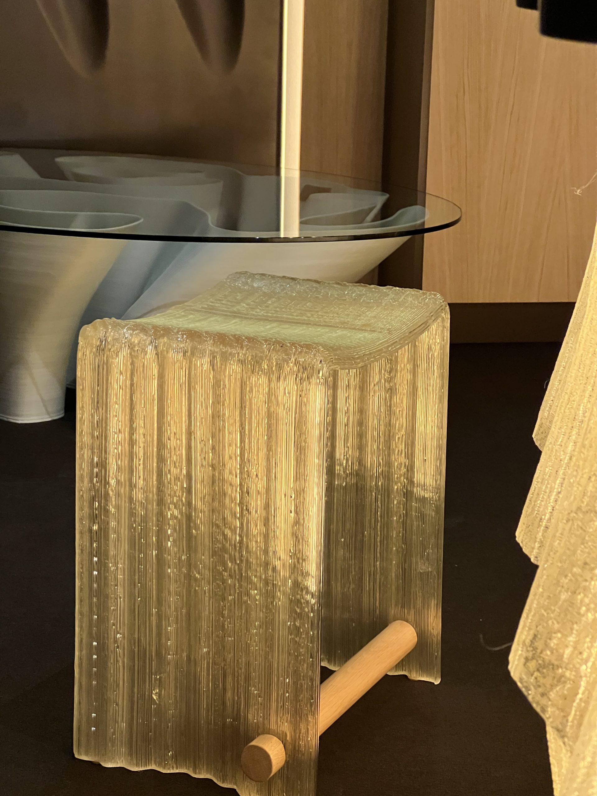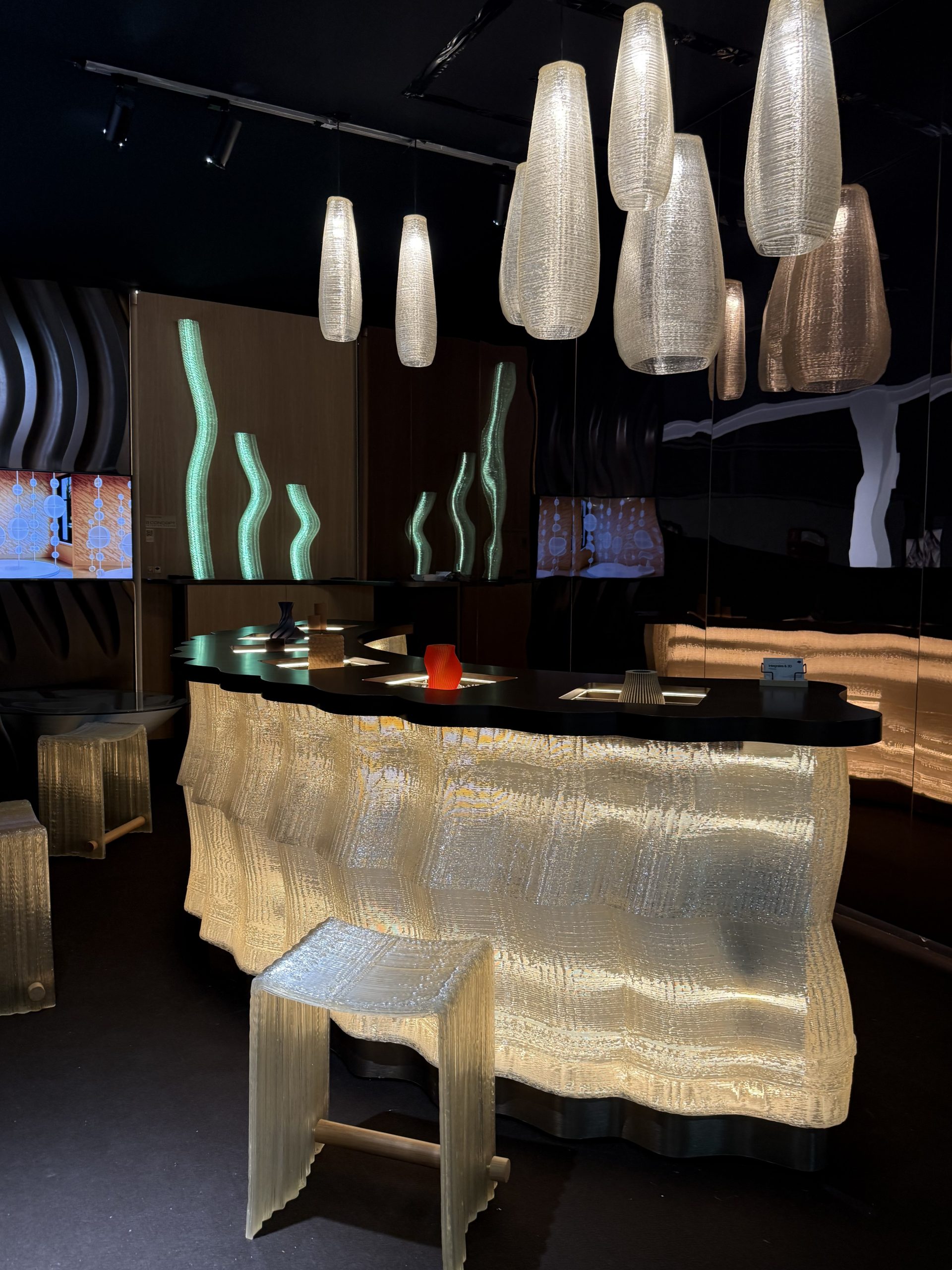 Dado que el espacio era limitado, planteamos un concepto inspirado en el mar, transmitiendo fluidez y organicidad a través de cada elemento. El corazón del stand es una barra curva de 2,70 m cuyo frontal reproduce el trazo que dejan las olas sobre la arena. Este elemento fue fabricado en pla retroiluminado con 3000K con intensidad regulable, y acompañado de una tapa lavada metalizada acrílica con seis espacios expositivos que muestran diferentes materiales, todos ellos con un 98% de biodegradabilidad.acompañado de un zócalo en hpl lacado en oro.